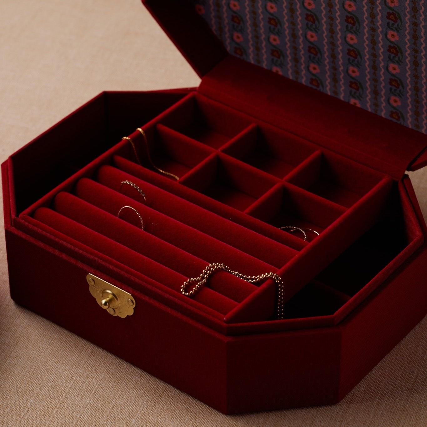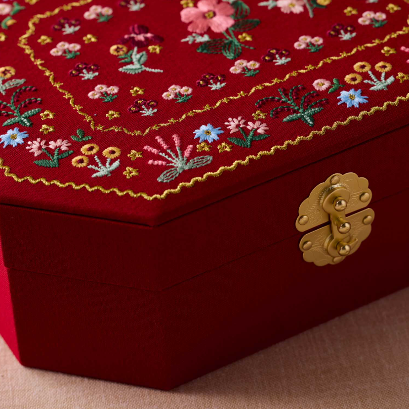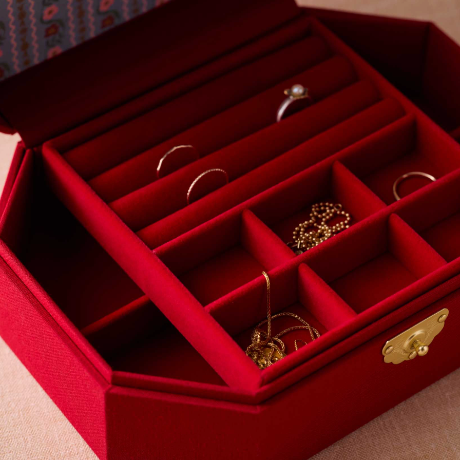 פתרון מעולה שישמור על התכשיטים שלך מסודרים וגם יהיה תוספת מהממת על שידת ההתארגנות או בחדר הארונות: קופסת תכשיטים רקומה ומצופה בד עם שלושה תאי אחסון גדולים בחלקו התחתון, שישה תאי אחסון קטנים ומגש נשלף עם חריצי טבעות מרופדים. קופסת התכשיטים מעוצבת בסגנון ייחודי וכוללת רקמה עדינה בשילוב חוטים מוזהבים של איוריה הפרחוניים והצבעוניים של אנה בונד, מאיירת ומקימת המותג. לקופסה סגירת וו מוזהבת ותא אחסון גדול ומרווח עם חלוקה חכמה ונוחה והיא תהיה מתנה מושלמת לעצמך, לבת משפחה או לחברה אהובה.