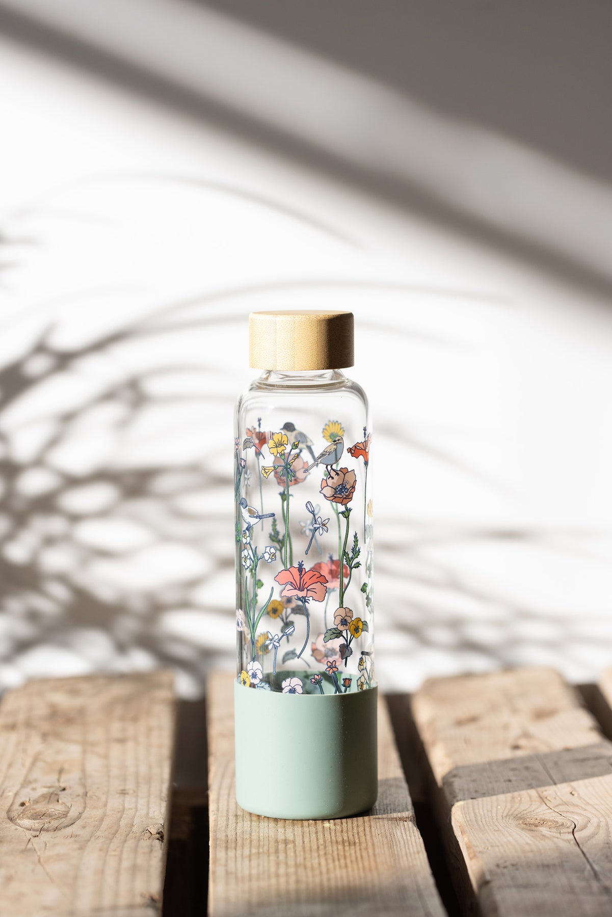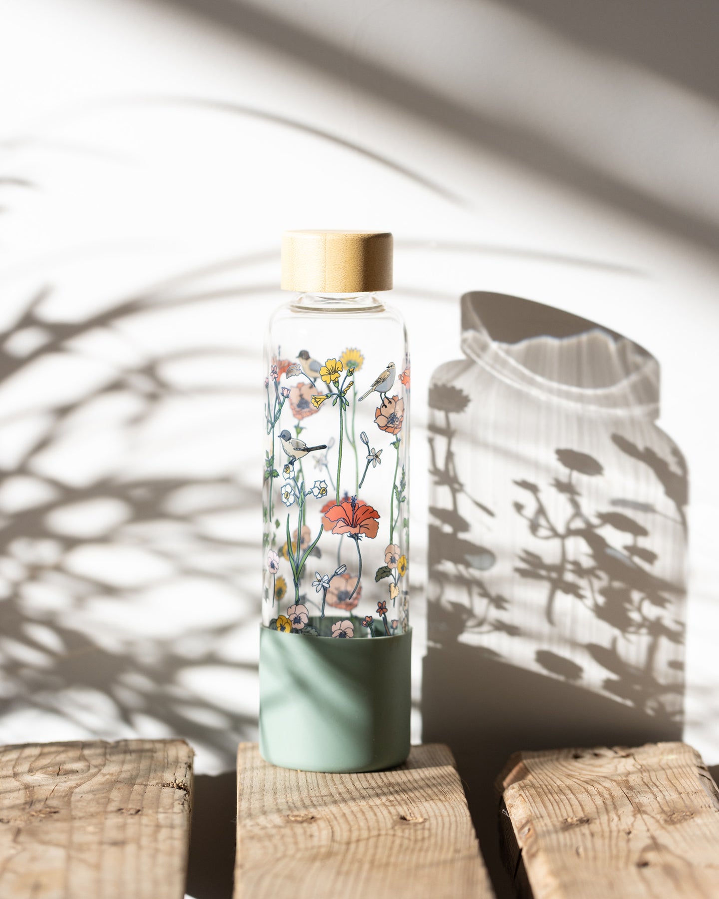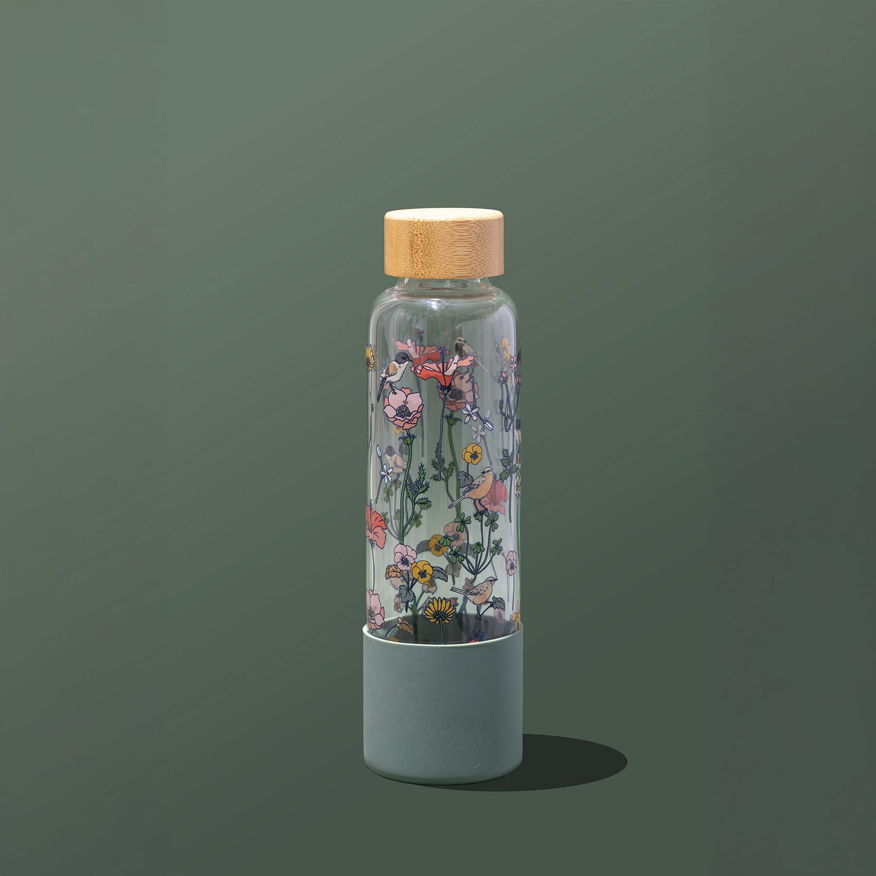בקבוק שתייה מעוצב עם איורים מקוריים בשילוב פויל מוזהב ועדין מתוך הקולקציה המקומית שלנו, שמעמידה במרכזה בעלי-חיים וצמחים ארצישראליים שהם חלק בלתי נפרד מנוף ילדותינו. הבקבוק עשוי מזכוכית בורוסיליקט (זכוכית עמידה וקלה), נסגר בהברגה עם מכסה עץ בהיר וכולל גם שרוול סיליקון המולבש על חלקו התחתון כדי לספק יציבות מירבית והגנה על הזכוכית בהנחת הבקבוק. הבקבוק יהיה שדרוג נהדר לשגרת המים שלך במשרד או בבית ואולי אפילו יגרום לך לשתות יותר במהלך היום :)