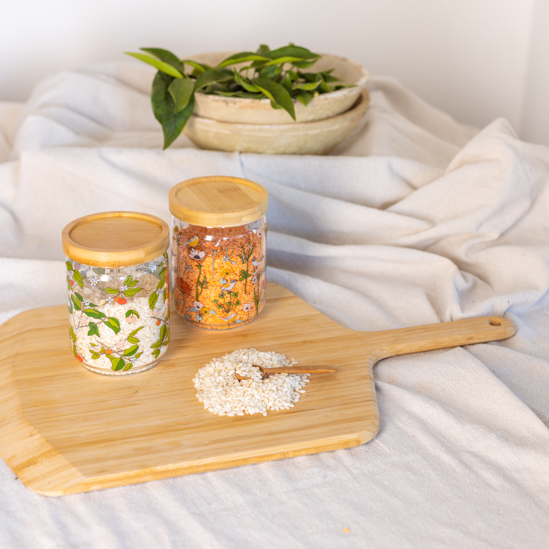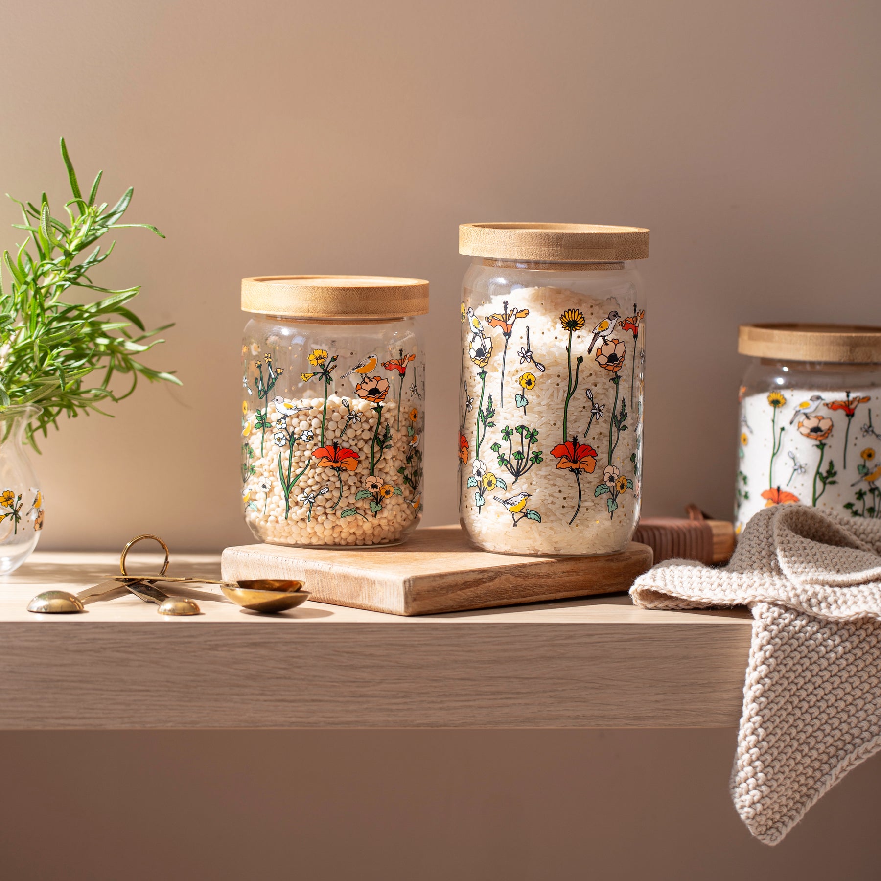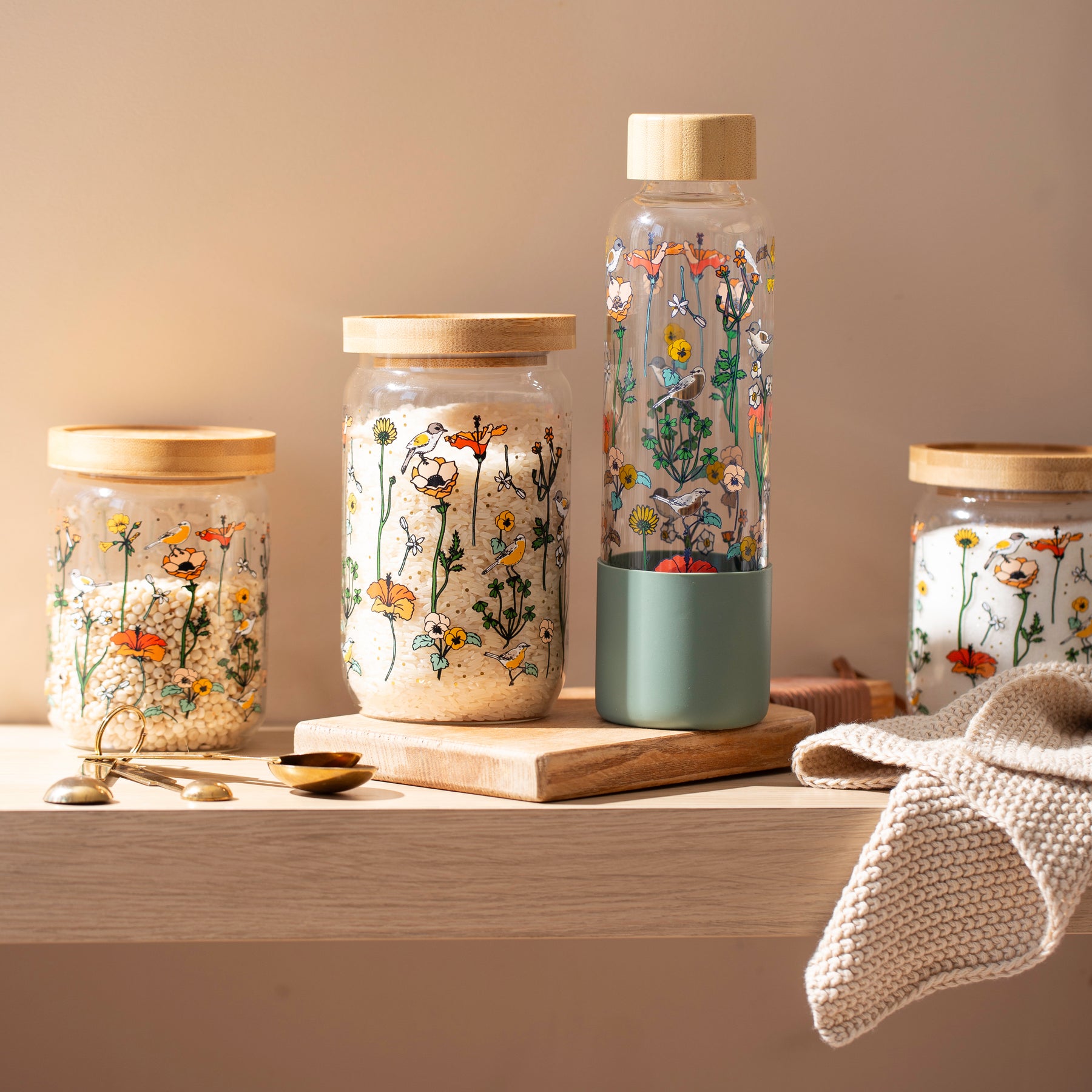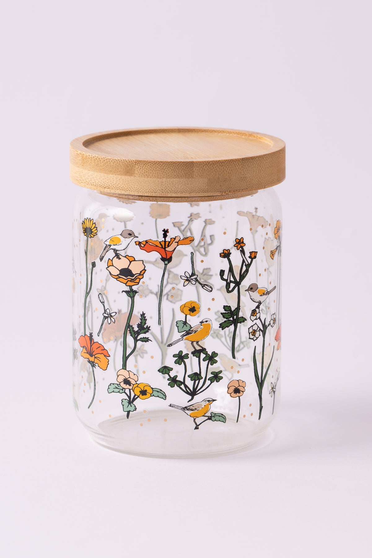 צנצנת זכוכית מעוצבת עם איורים מקוריים מתוך הקולקציה המקומית שלנו, שמעמידה במרכזה בעלי-חיים וצמחים ארצישראליים שהם חלק בלתי נפרד מנוף ילדותינו. הצנצנת עשויה מזכוכית בורוסיליקט (זכוכית עמידה וקלה) עם איורים פרחוניים ונגיעות פויל מוזהבות. הצנצנת נסגרת במכסה עץ בהיר עם פס סיליקון לאיטום מוחלט, שצורתו גם מאפשרת לערום צנצנות אחת על גבי השנייה כדי לחסוך במקום אחסון על השיש או בארון. צנצנת הזכוכית תהיה נהדרת לעיצוב הבית או המטבח, לאחסון של עוגיות או כל דבר אחר שתבחרי.