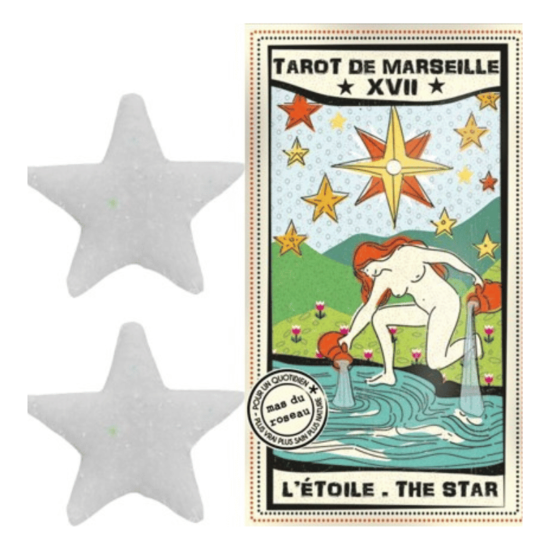 זוג סבונים מוצקים בצורת כוכב שמגיעים במארז צבעוני ויפהפה, שמעוצב בהשראת קלפי הטארוט של מרסיי שנוצרו בדרום צרפת במאות ה-17 וה-18 ונחשבים למקור השראה היסטורי לעיצובי טארוט מודרניים רבים. הסבונים האיכותיים מיועדים לשימוש יומיומי על עור הפנים, הגוף והידיים והם מבוססים על שמנים צמחיים ותמציות שנבחרו בקפידה כדי להעניק לעור חוויה של רכות, גמישות ומראה בריא.