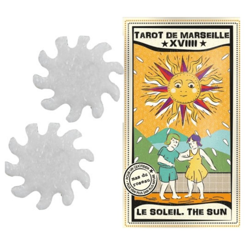 זוג סבונים מוצקים בצורת שמש שמגיעים במארז צבעוני ויפהפה, שמעוצב בהשראת קלפי הטארוט של מרסיי שנוצרו בדרום צרפת במאות ה-17 וה-18 ונחשבים למקור השראה היסטורי לעיצובי טארוט מודרניים רבים. הסבונים האיכותיים מיועדים לשימוש יומיומי על עור הפנים, הגוף והידיים והם מבוססים על שמנים צמחיים ותמציות שנבחרו בקפידה כדי להעניק לעור חוויה של רכות, גמישות ומראה בריא.