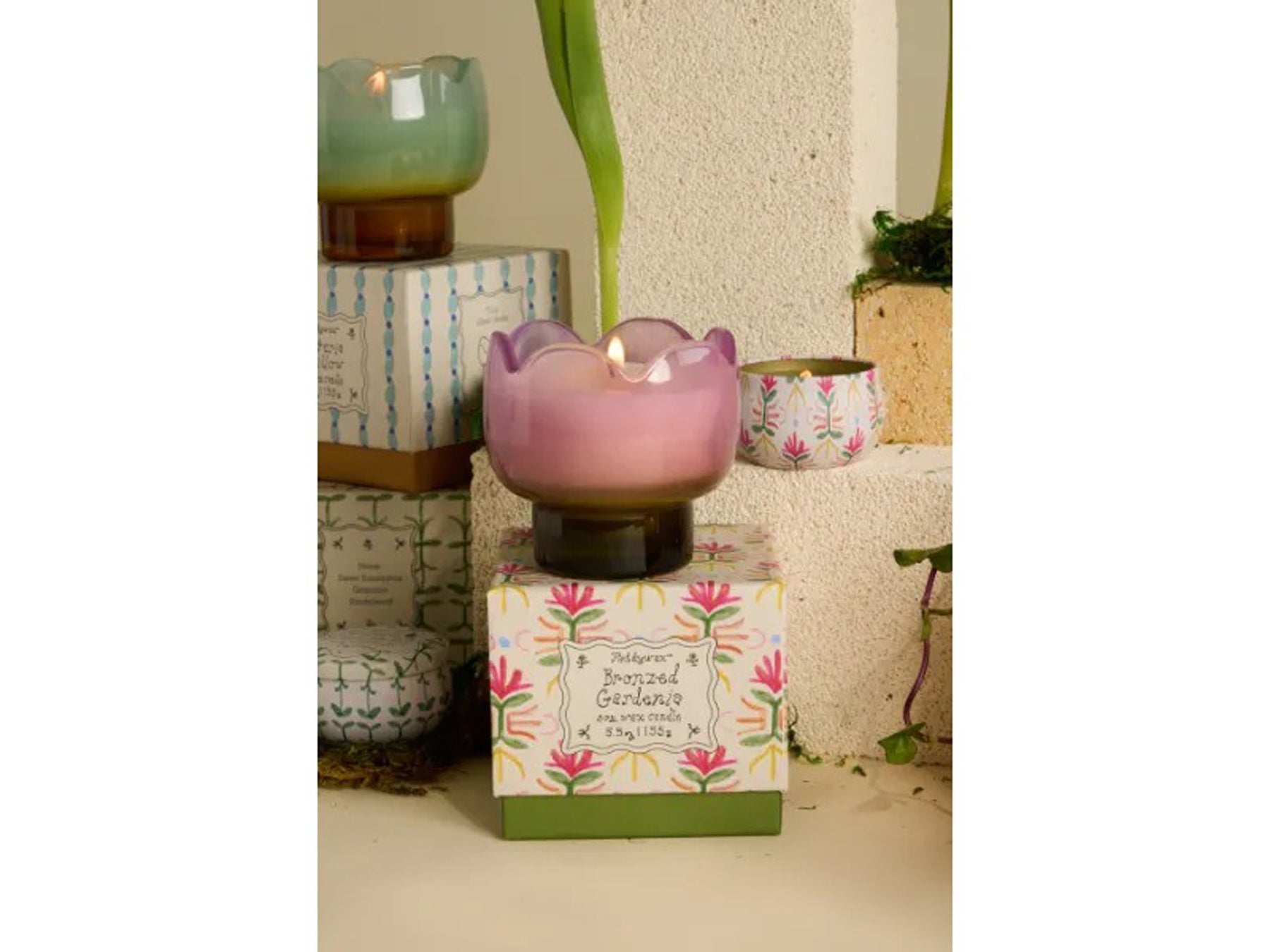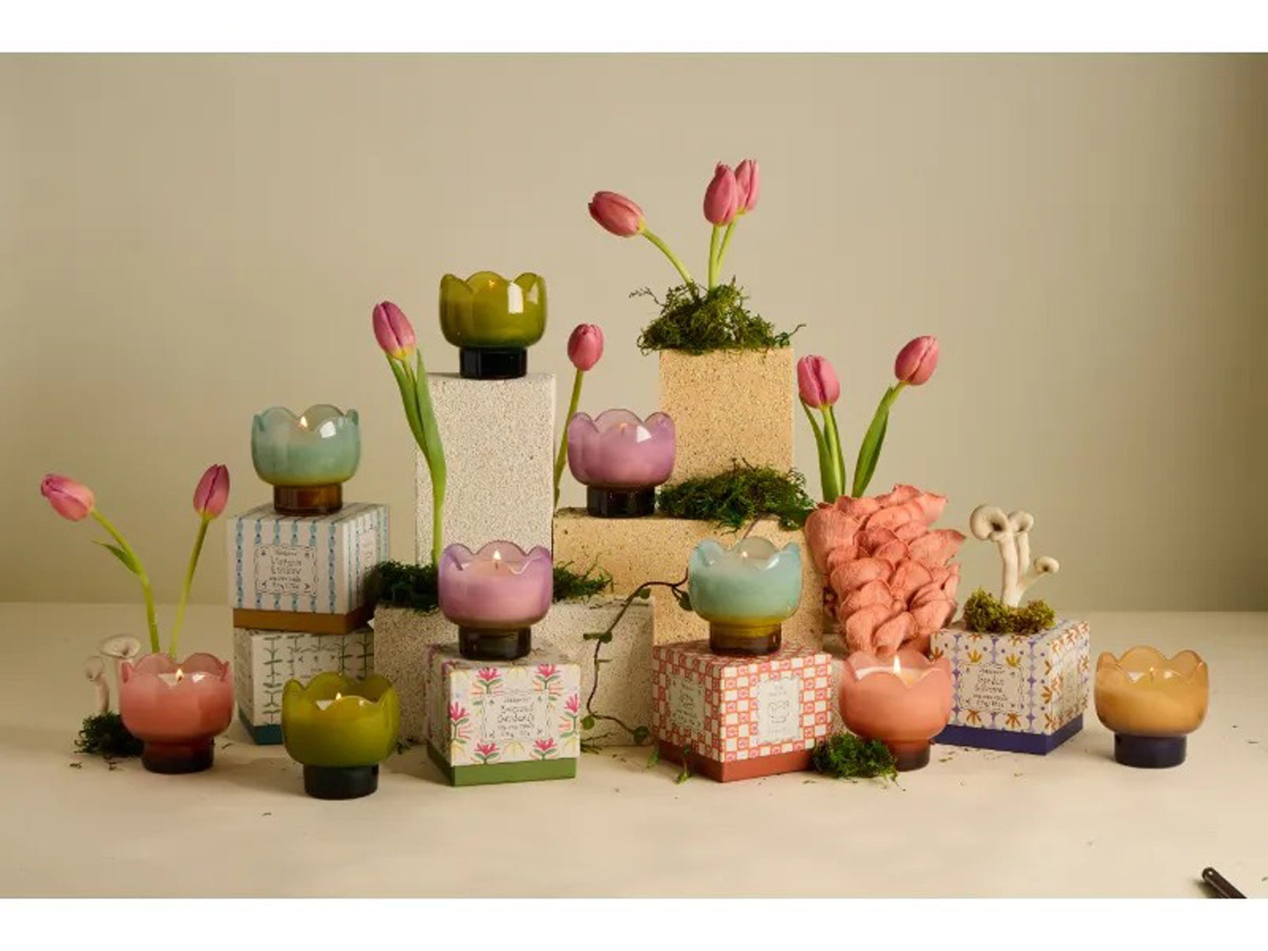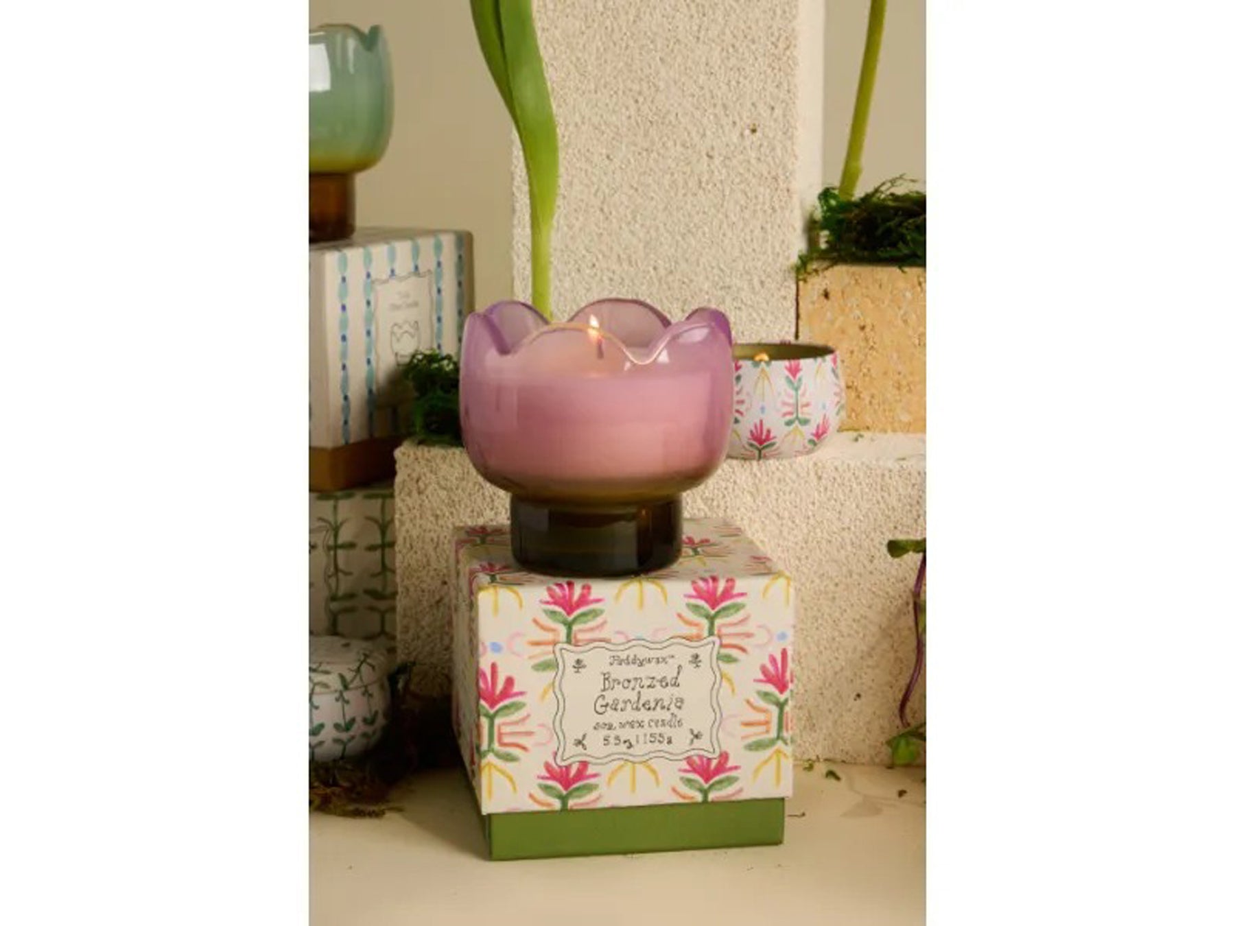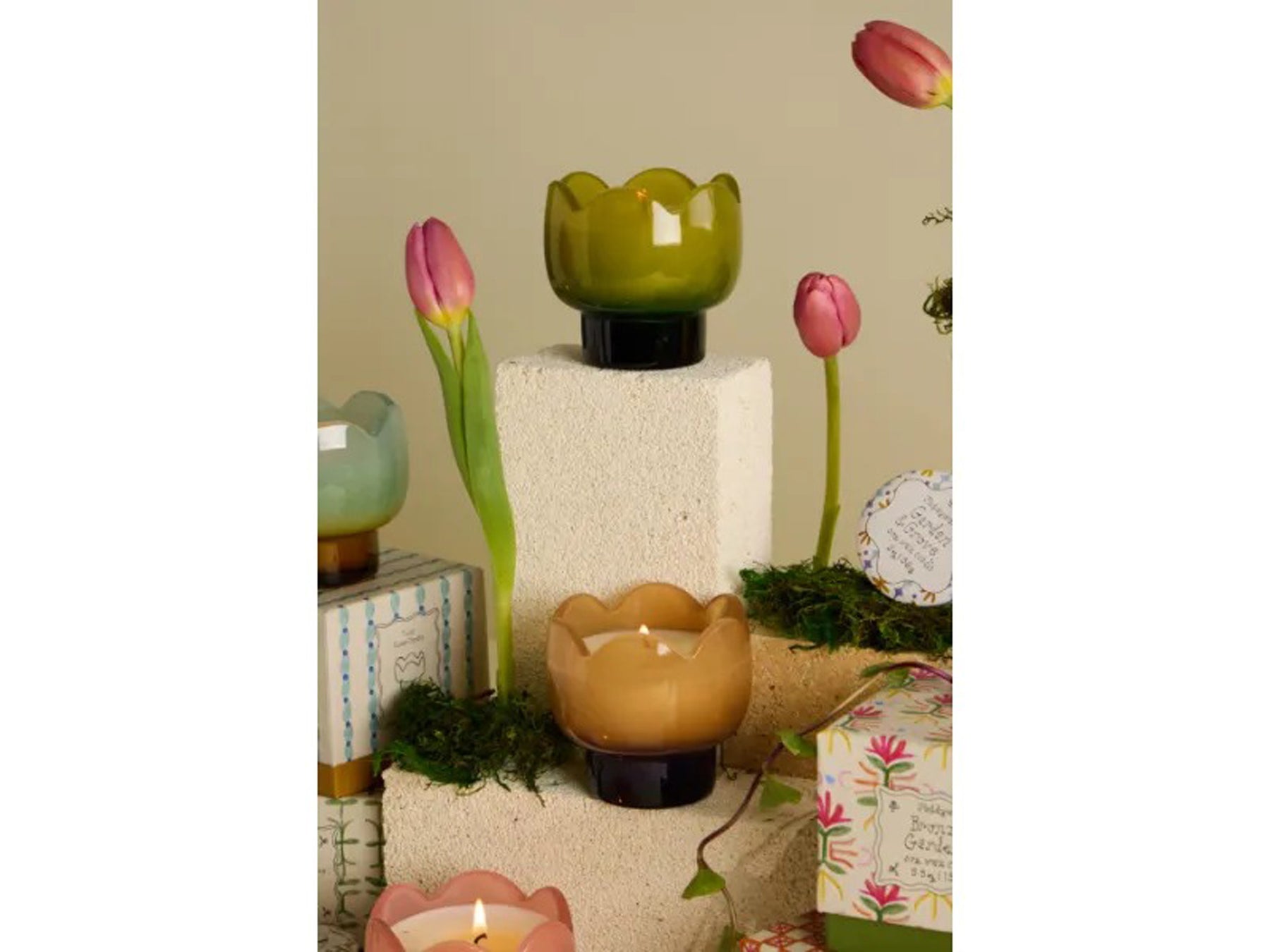 הנר מסדרת Tulip יצוק בתוך כלי זכוכית.