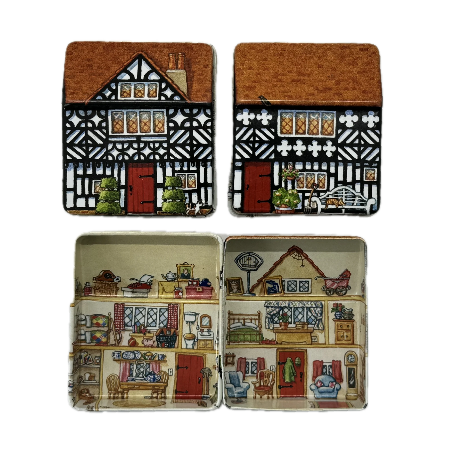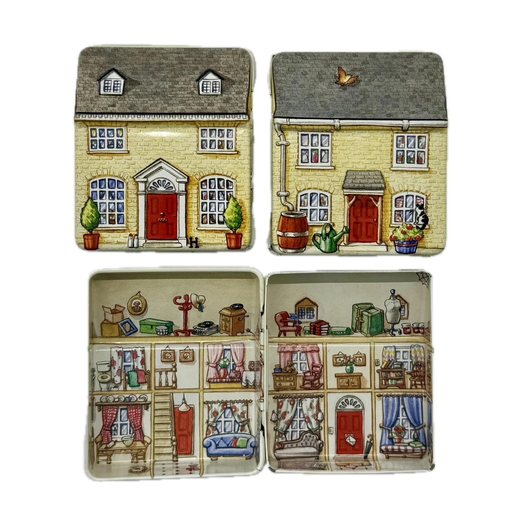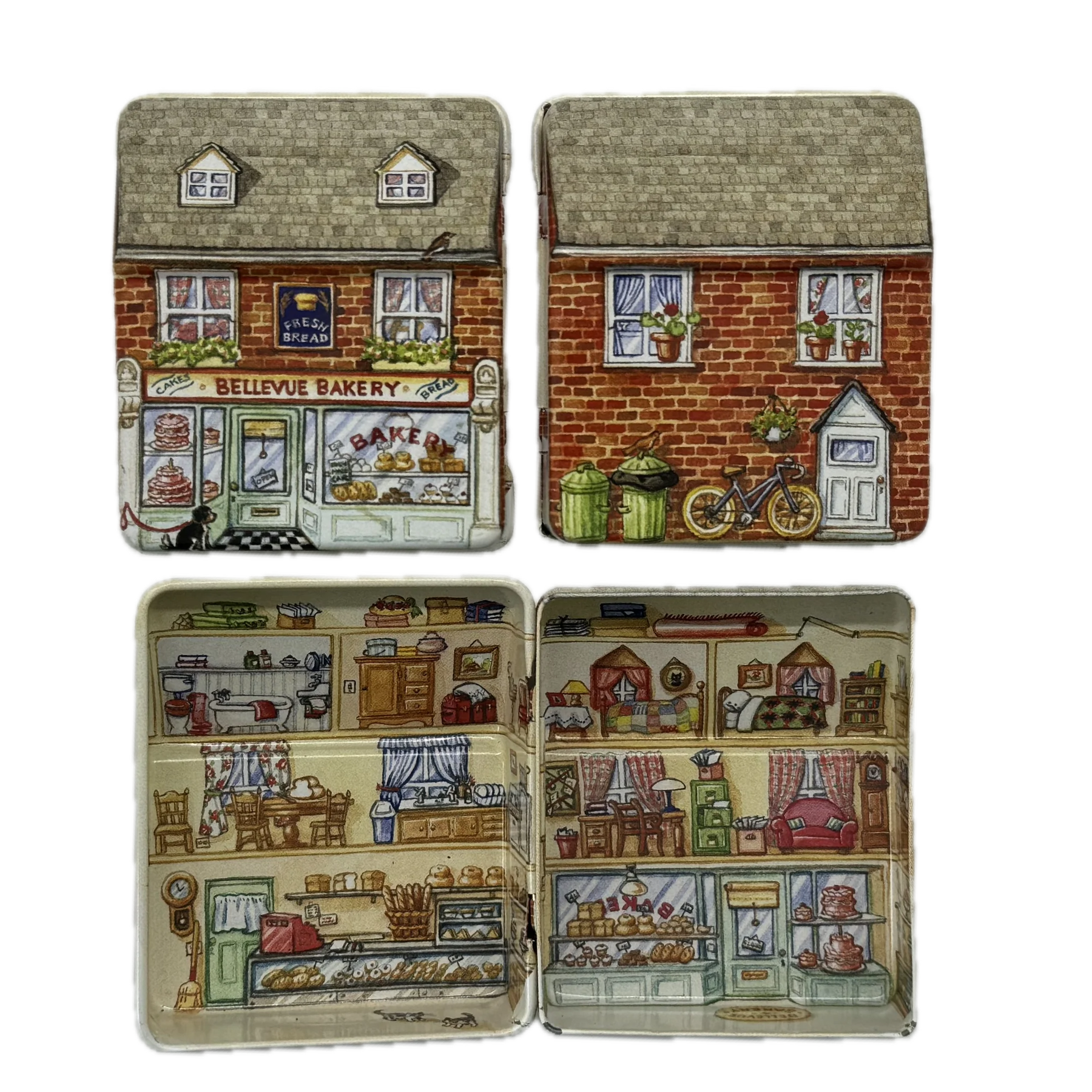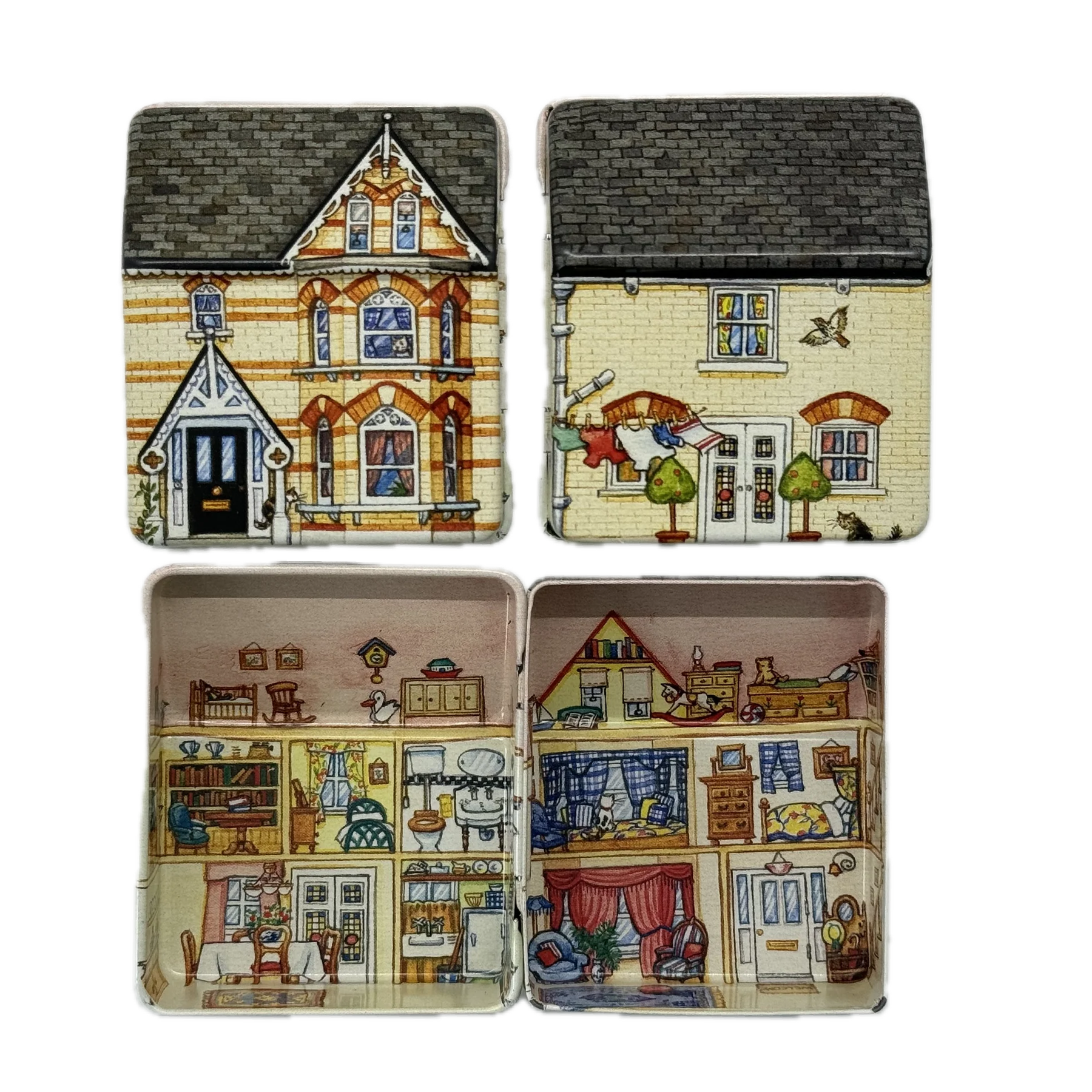 קופסת פח קטנה שמעוצבת בצורת בית בובות קטן ואפילו נפתחת כמוהו, מעוטרת באיורים קטנטנים ומלאי פרטים מתוקים שתהיה מושלמת לאריזת מתנה קטנטנה לאהוב/ה, כמתנה בפני עצמה או לשמירה על החפצים הקטנים שמפוזרים לך בתיק: מסטיקים, תכשיטים, תרופות, סיכות ועוד מלא אפשרויות אחרות.