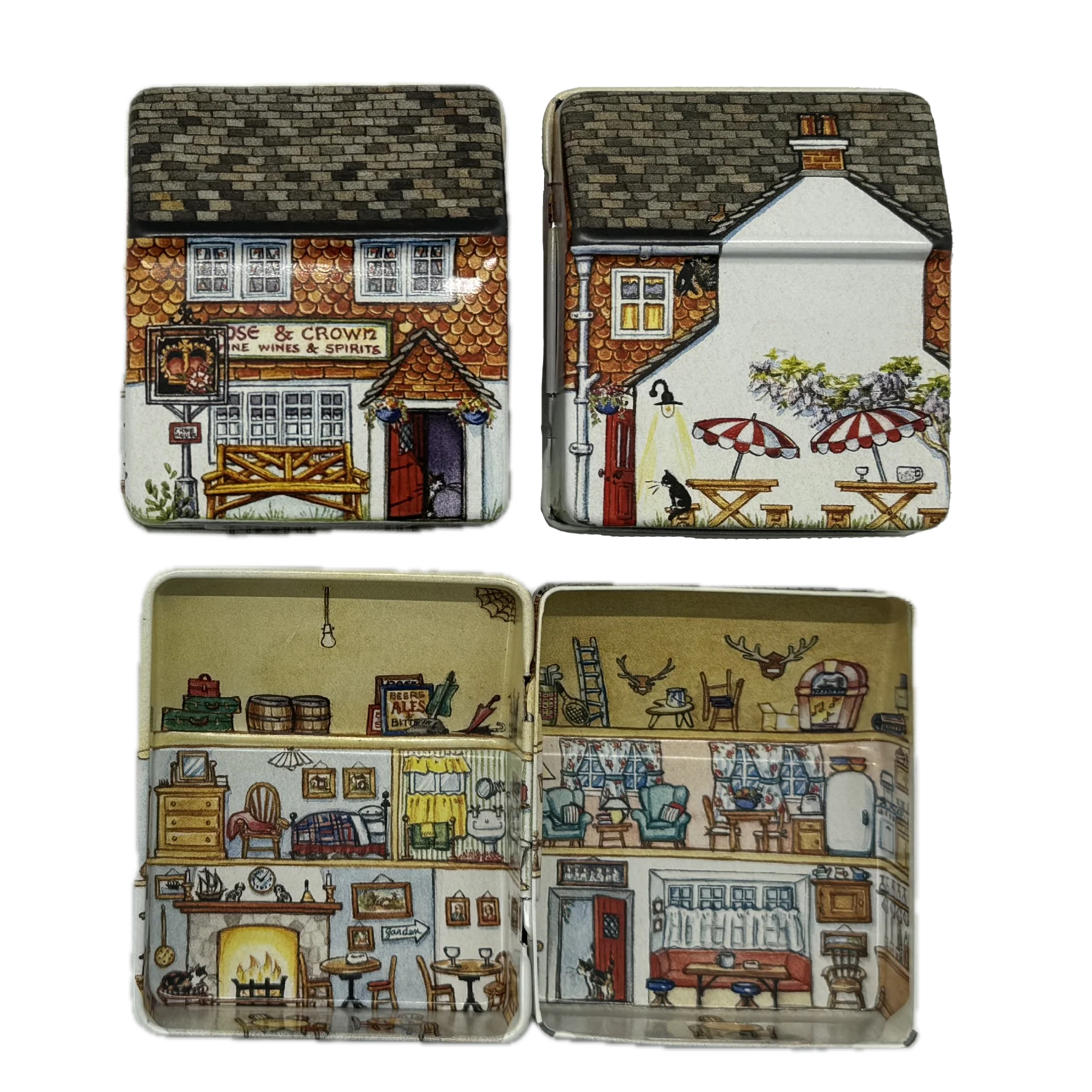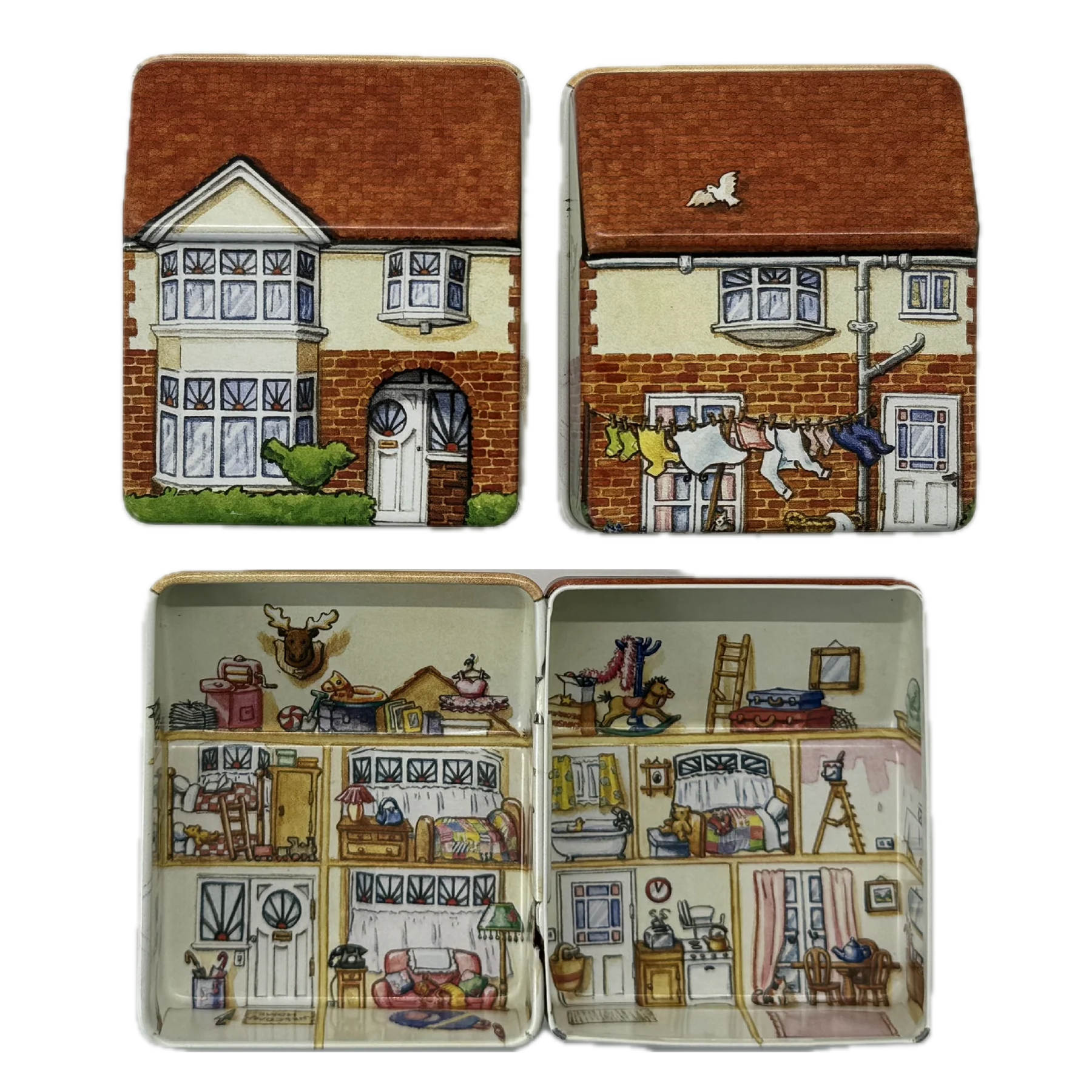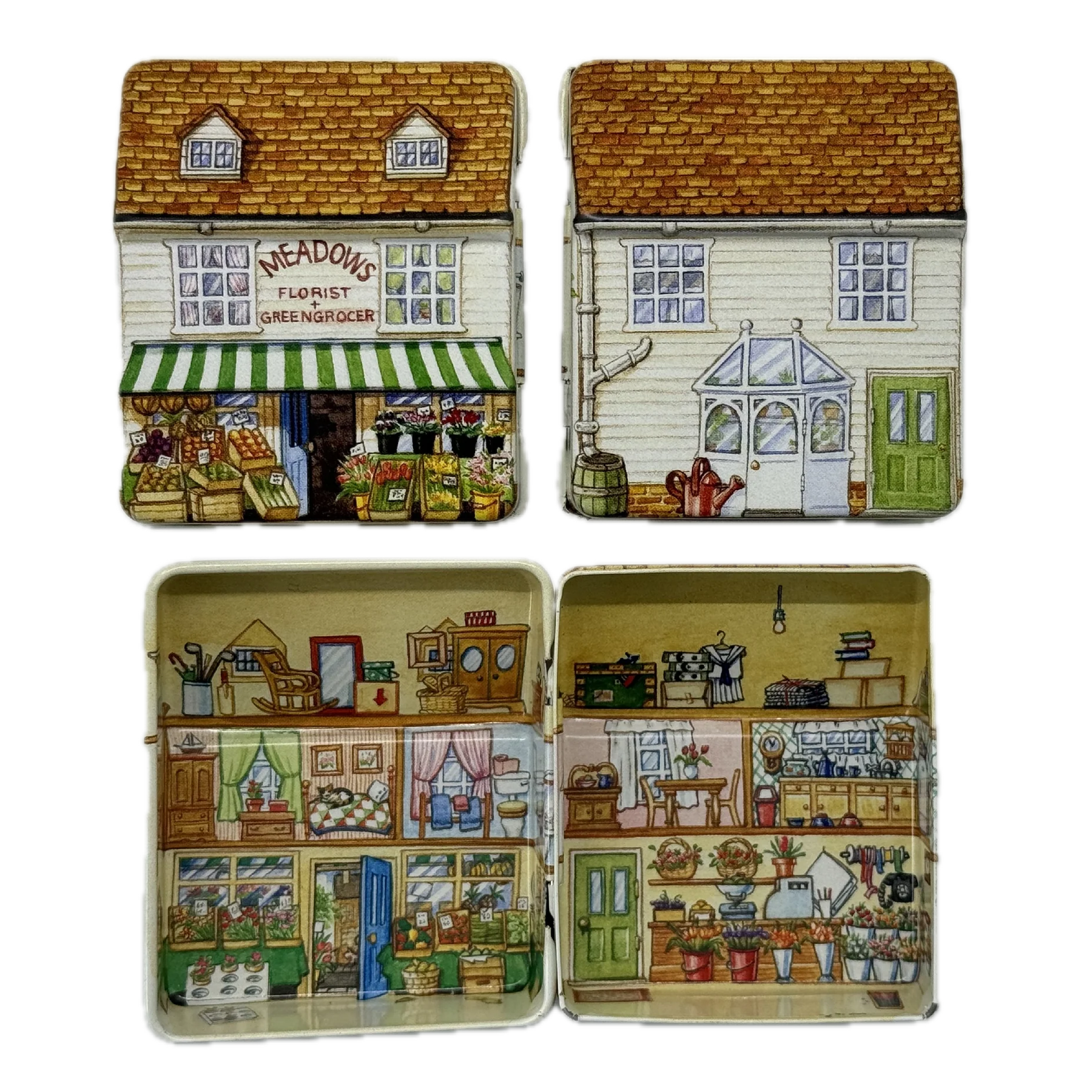 קופסת פח קטנה שמעוצבת בצורת בית בובות קטן ואפילו נפתחת כמוהו, מעוטרת באיורים קטנטנים ומלאי פרטים מתוקים שתהיה מושלמת לאריזת מתנה קטנטנה לאהוב/ה, כמתנה בפני עצמה או לשמירה על החפצים הקטנים שמפוזרים לך בתיק: מסטיקים, תכשיטים, תרופות, סיכות ועוד מלא אפשרויות אחרות.
