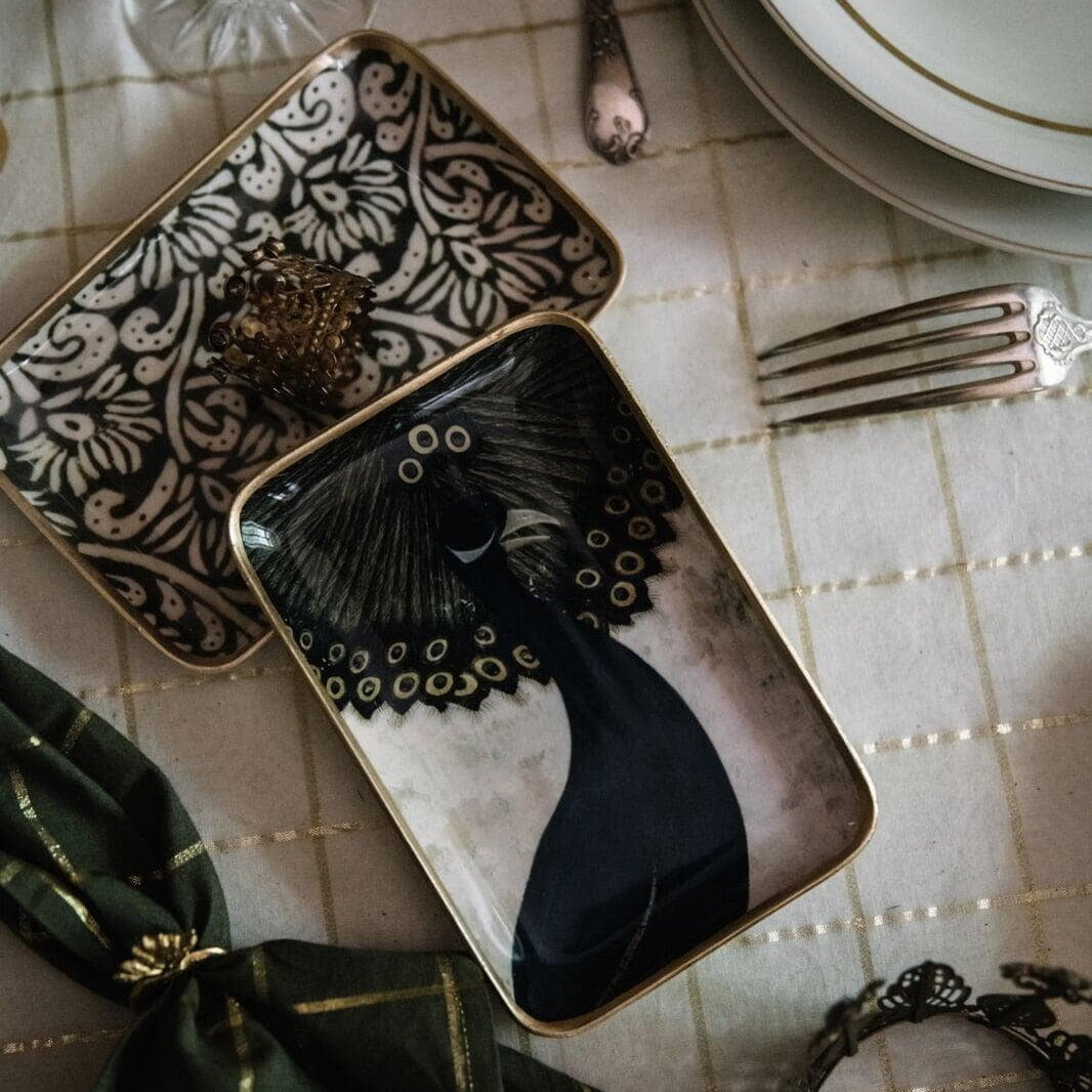 צלוחית מלבנית מעוצבת עם איורים בסגנון וינטג׳ ומסגרת מוזהבת שעשויה כולה מאלומיניום בציפוי אמייל, עם גימור מבריק ותחושה חלקה ונעימה למגע. הצלוחית תהיה מושלמת לתכשיטים, למפתחות, לסבון ידיים או לריכוז החפצים הקטנים שבדרך כלל מתפזרים ברחבי הבית והיא יכולה להפוך בקלות גם לתמונה דקורטיבית שתלויה על הקיר או מוצגת על מדף - ככה או ככה, היא תהיה תוספת מעולה וייחודית שתשדרג ברגע את עיצוב הבית :)