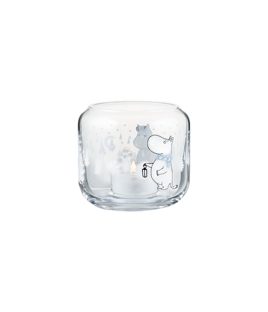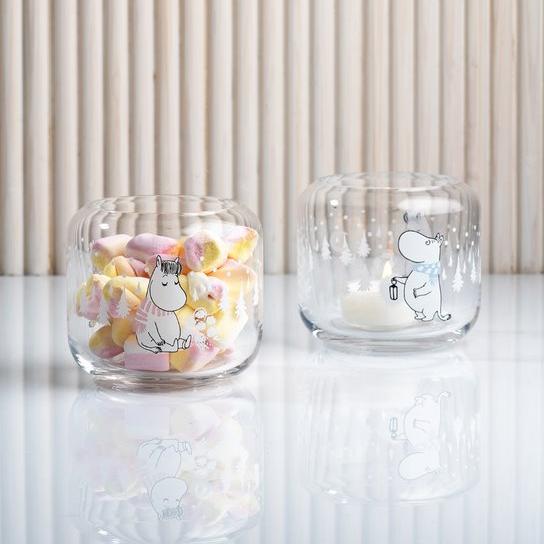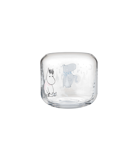 כלי לנר עשוי מזכוכית בעבודת יד שמעוטר באיוריה המתוקים של טובה ינסון - המאיירת המקורית של המומינים. כלי הזכוכית יכול לשמש כמעמד לנר, כאגרטל לזר פרחים קטן ויפה או לכל שימוש אחר שתבחרי והוא יהיה תוספת משמחת לכל פינה בבית.